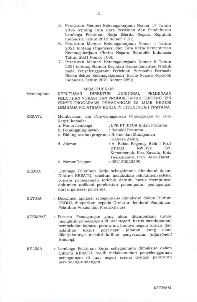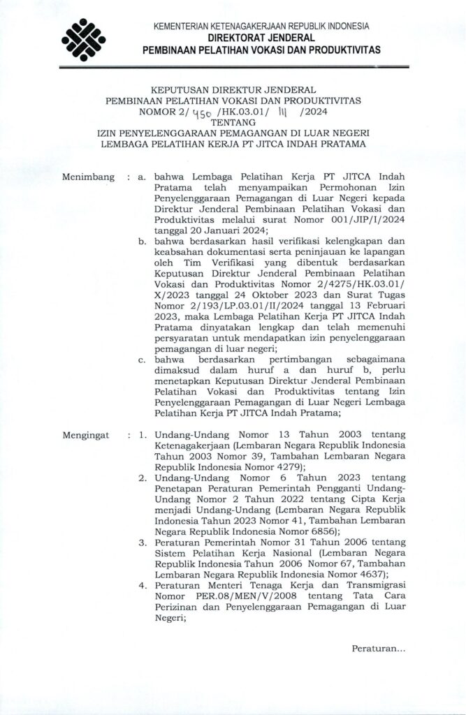 JITCA LPKは、インドネシア政府のオンライン単一申請(OSS)システムに基づき、リスクベースの事業ライセンス規定を遵守しています。
